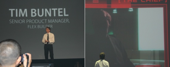 Heute Dienstag war nun die zweite Keynote mit Ben Forta. Als erstes tritt Tim Buntel (Product Manager Flex Builder, vorher von ColdFusion) auf die Bühne und will was von erzählen als ein Video Chat von Chief "L" reinkommt.