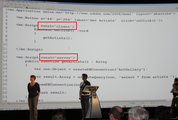 Gezeigt wurde eine Möglichkeit Actions Script Code auf dem Server auszuführen. Wobei der Code für Server und Client in einer Datei vorhanden ist.